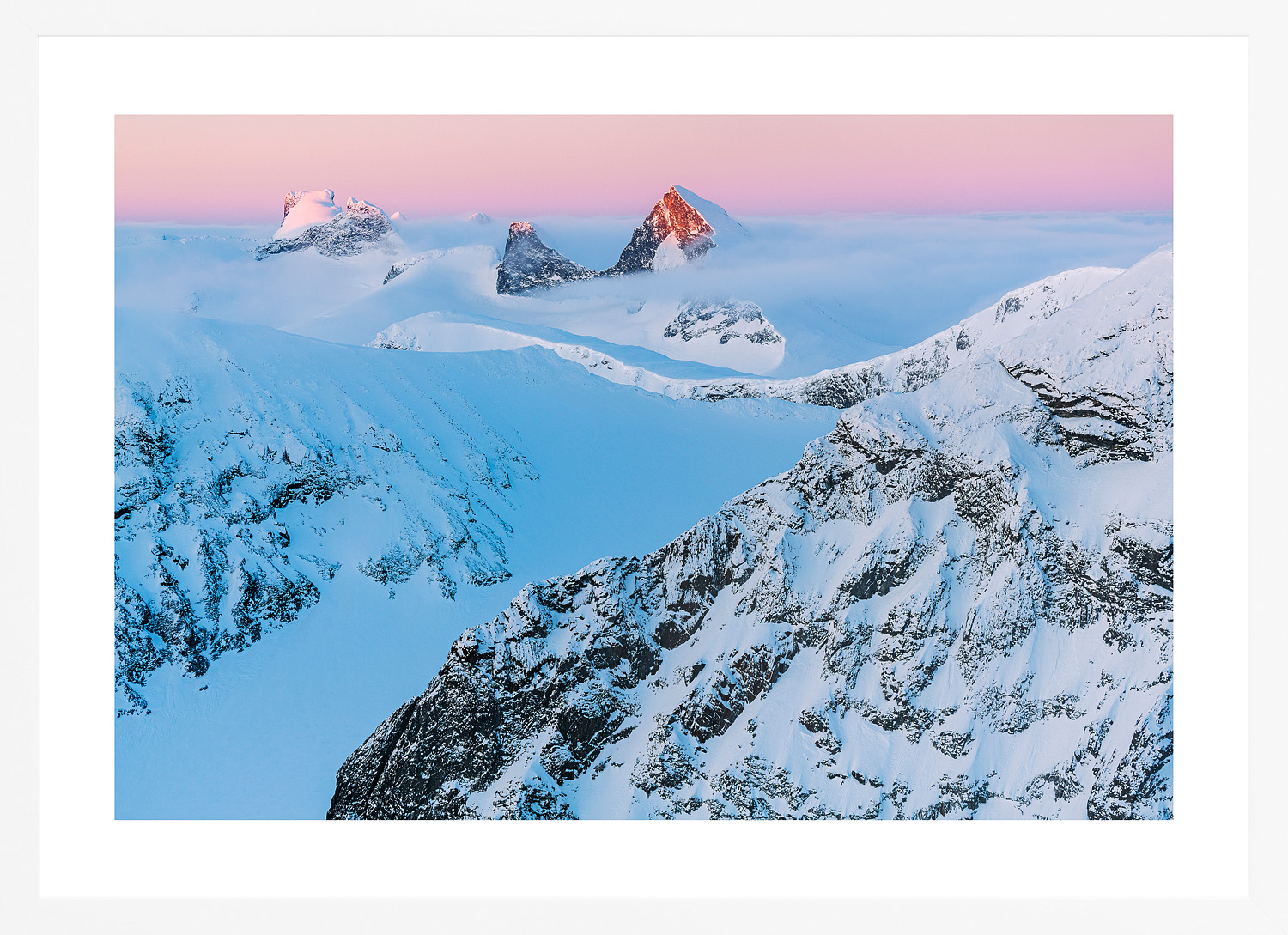 - print mounted on 5mm thick foam board and framed in 2 cm wide, matte white wooden frame with 70% UV anti-reflective artglass